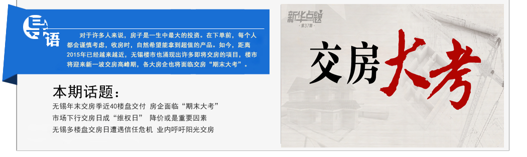 對(duì)于許多人來(lái)說(shuō),房子是一生中最大的投資。在下單前,每個(gè)人都會(huì)謹(jǐn)慎考慮,收房時(shí),自然希望能拿到超值的產(chǎn)品。如今,距離2015年已經(jīng)越來(lái)越近,無(wú)錫樓市也涌現(xiàn)出許多即將交房的項(xiàng)目,樓市將迎來(lái)新一波交房高峰期,各大房企也將面臨交房“期末大考”。