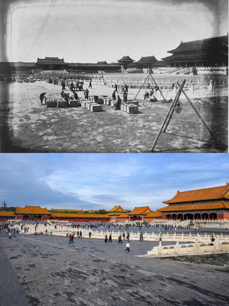 上图为1933年2月拍摄的太和门广场第一批文物南迁时的情景(故宫博物院供图);下图为2025年10月10日拍摄的太和门广场(新华社记者 金良快 摄)。