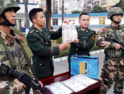 北海邊防支隊民警展示查獲的毒品冰毒
