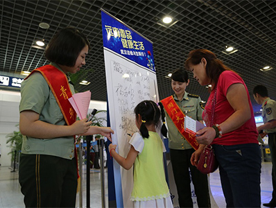官兵發動旅客現場簽名承諾“遠離毒品”