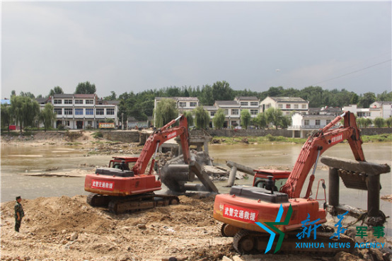 在湖北紅安七里坪鎮(zhèn),武警交通二總隊官兵拆除損毀的橋梁。