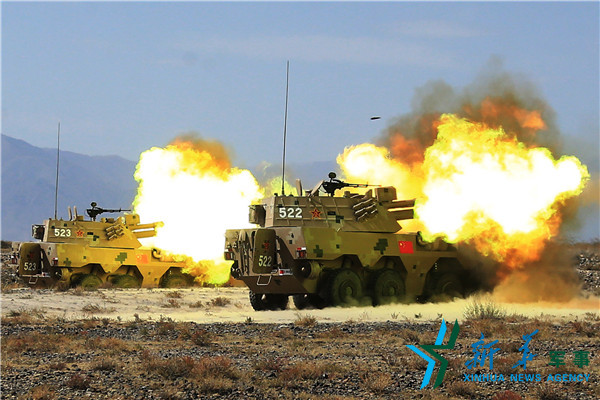 ??? 在吉爾吉斯斯坦巴雷克奇舉行的“和平使命—2016”上海合作組織聯合反恐軍事演習第三次實兵實彈合練中,中方自行火炮進行實彈射擊(9月19日攝)。新華社發(王寧 攝)