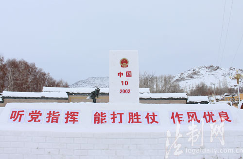 圖為2016年12月29日,新疆阿勒泰邊防支隊汗德尕特邊防派出所官兵完成“聽黨指揮 能打勝仗 作風優良”雪雕作品