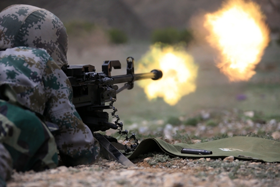 2016年4月25日,西部戰(zhàn)區(qū)陸軍某團(tuán)機(jī)槍連官兵攜帶重機(jī)槍對(duì)“敵”目標(biāo)實(shí)施火力打擊。視覺(jué)中國(guó)供圖(資料圖片)