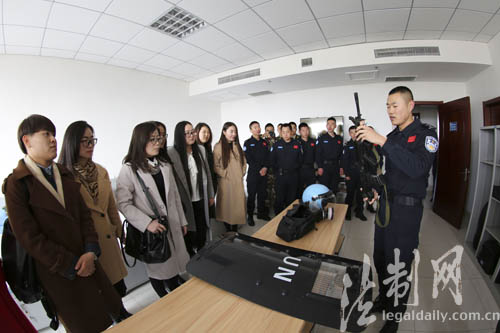 ????上午9時,一輛掛著“相約藍盔、愛在警營”紅色橫幅的大巴車緩緩駛入警隊營區。一下車,姑娘們饒有興致地參觀了警隊內務設置和裝備展示,現場觀看了藍盔方陣扣人心弦的戰術表演,隊員們氣吞萬里的練兵激情、敢打必勝的過硬素質,一下子吸引了大家的眼光。在此之前,她們只是在心中默默仰慕那頂“藍色貝雷帽”,從電視上看到過威武帥氣的維和隊員。第一次如此近距離接觸,讓不少姑娘的心中蕩起層層漣漪。