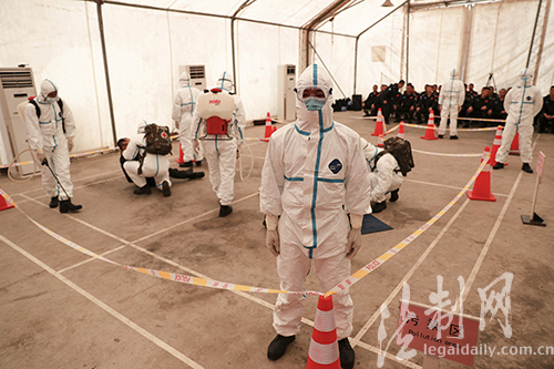 圖為維和警察防暴隊開展綜合防疫衛勤科目演練