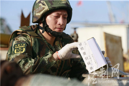 圖為邊防官兵對成品油進行抽樣送檢