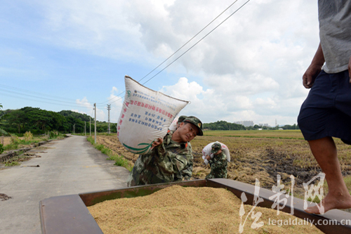 ????7月11日,廣東邊防總隊中山邊防支隊沙頭涌邊防派出所開展搶收稻谷助農服務活動,邊防官兵走上田間地頭幫助農戶收割、幫運稻谷,得到他們廣泛好評。