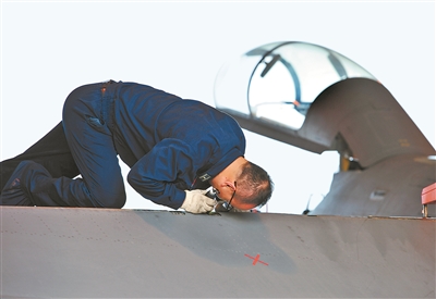 7月7日下午,空軍某飛訓基地組織跨晝夜飛行。戰機歸來后,一名機械師單膝跪在機翼上,臉緊貼戰機縫隙檢查動作筒有無漏油。由于工作需要,機務人員經常需要彎腰低頭、鉆進狹小機艙,有時一彎就是小半天,很容易患上腰肌勞損等常見病,但為了讓飛機不“帶病”上天,這名機械師把身體彎成了與座艙蓋相似的弧度。徐晨桐、靳翚淇 攝影報道