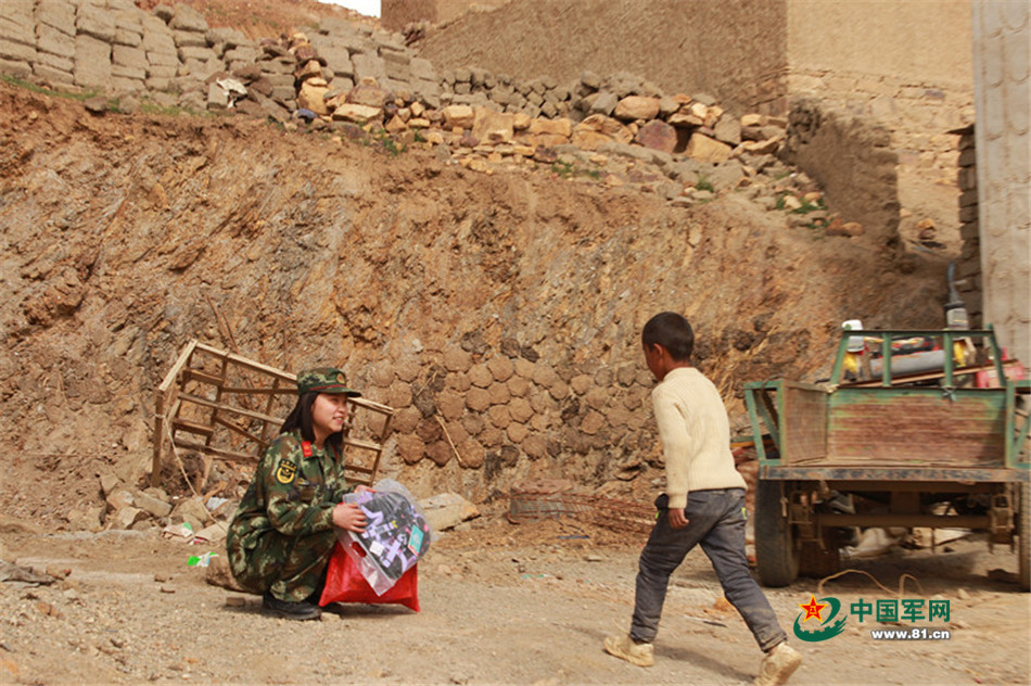 在外面玩耍的大多杰看到邊防媽媽黃曉娟,忍不住小跑了過去。
