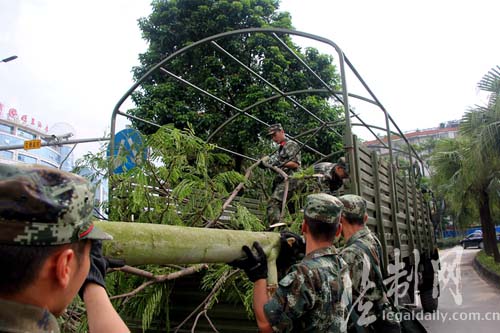 ????自8月23日開始,今年第13、14號(hào)臺(tái)風(fēng)“天鴿”、“帕卡”相繼在廣東沿海登陸。位于臺(tái)風(fēng)登陸途徑的廣東省江門市遭受了嚴(yán)重的破壞,市區(qū)道路兩邊大量樹木被吹倒,甚至被連根拔起。為最大限度減少臺(tái)風(fēng)帶來(lái)的損失,8月24日至8月28日,廣東邊防總隊(duì)江門邊檢站官兵積極響應(yīng)江門市委、市政府的號(hào)召,迅速動(dòng)員部署,先后組織200余名官兵深入駐地受災(zāi)街道開展災(zāi)后清理工作,幫助群眾重建家園,以實(shí)際行動(dòng)踐行全心全意為人民服務(wù)的宗旨,受到駐地黨政職能部門和人民群眾的一致好評(píng)。