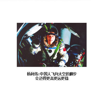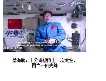 ??? 為了人類的和平與進步,中國人來到了太空。2003年10月15日,我搭乘神舟五號飛船,在太空飛行14圈,歷時21小時23分,完成了中國首次載人航天飛行。雖然是獨自在太空飛行,但一想到億萬祖國人民翹首以待,我覺得不是一個人在飛。于是我拿起太空筆,在工作日志的背面寫上了這樣一句話:“為了人類的和平與進步,中國人來到了太空”,并在艙內鏡頭前向祖國人民、世界人民展示?!盀榱巳祟惖暮推脚c進步”,是中國發展載人航天事業的初衷,“中國人來到了太空”既描述了一個歷史時刻,也表達了我為祖國航天事業感到無比自豪的心情。?
