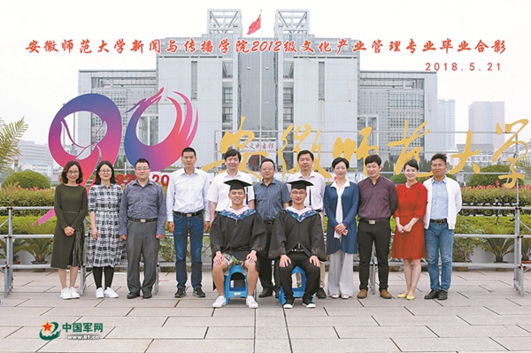 5月21日,安徽師范大學(xué)新聞與傳播學(xué)院組織應(yīng)屆畢業(yè)生拍攝畢業(yè)照,眾多班級的學(xué)生依次排隊(duì)拍攝,其中一個(gè)班級與眾不同——只有兩名學(xué)生,而與他倆合影的卻有11名老師。并且,11名老師站在后排,兩名學(xué)生坐在前排。當(dāng)相機(jī)的快門摁下之后,這張照片成為該校濃厚尊崇軍人氛圍的亮麗名片。