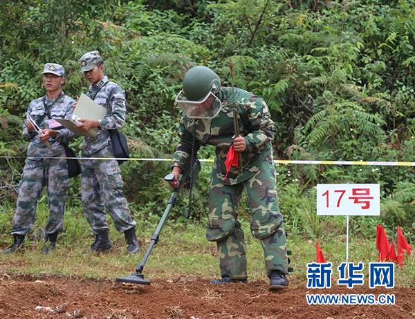 參訓官兵到中越邊境麻栗坡某雷場參觀識別已搜排出的地雷及爆炸物(8月26日攝)。 新華社發(張輝 攝)