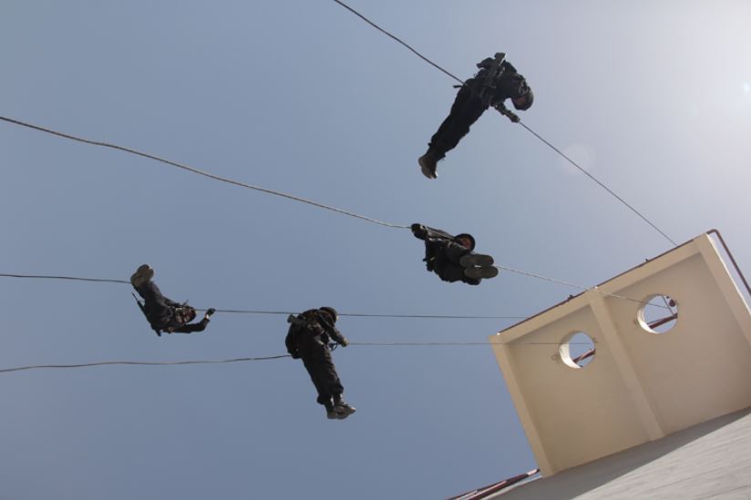 ????資料圖片:武警新疆總隊四支隊特勤中隊進行樓房索降訓練。新華社發(楊皓 攝)