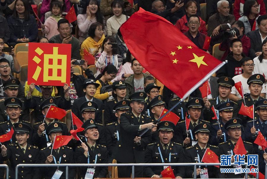 10月22日,觀眾在看臺(tái)為中國隊(duì)加油助威。 當(dāng)日,在武漢進(jìn)行的第七屆世界軍人運(yùn)動(dòng)會(huì)女子排球決賽中,中國隊(duì)以1比3不敵巴西隊(duì),獲得亞軍。 新華社記者賀長山攝