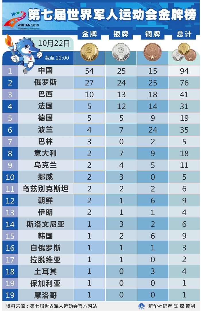 22日比賽結(jié)束后,中國軍團(tuán)以54金25銀15銅繼續(xù)位居金牌榜和獎(jiǎng)牌榜第一,俄羅斯隊(duì)以27金24銀25銅位居金牌榜和獎(jiǎng)牌榜次席,巴西隊(duì)以10金13銀18銅排在金牌榜和獎(jiǎng)牌榜第三。