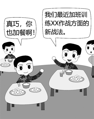 ????“真巧,你也來加餐啊。”“是啊,我們營(yíng)最近在研訓(xùn)新戰(zhàn)法,有時(shí)會(huì)加班訓(xùn)練……我跟你說,我們研究的新戰(zhàn)法主要是××作戰(zhàn)方面,據(jù)說要在全旅推廣呢!”