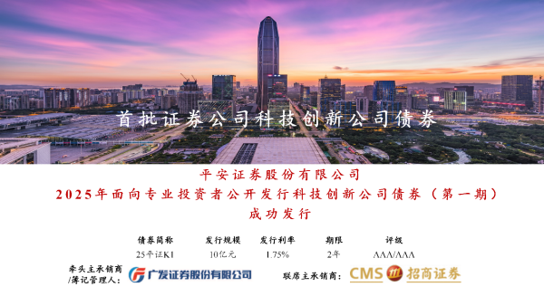 作为沪深交易所首批公开发行科创债的券商,平安证券于近期完成10亿元科技创新公司债券发行。该债券期限2年,票面利率1.75%,募集资金将主要用于支持科技创新领域业务,提升债券市场服务科技创新能力。