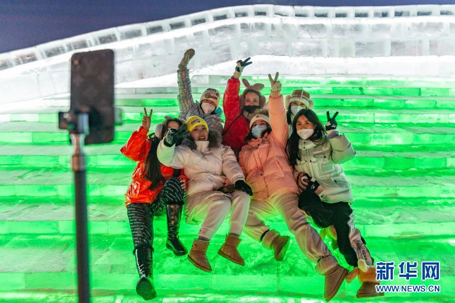 2020年12月24日,游客在哈爾濱冰雪大世界園區(qū)內(nèi)自拍。