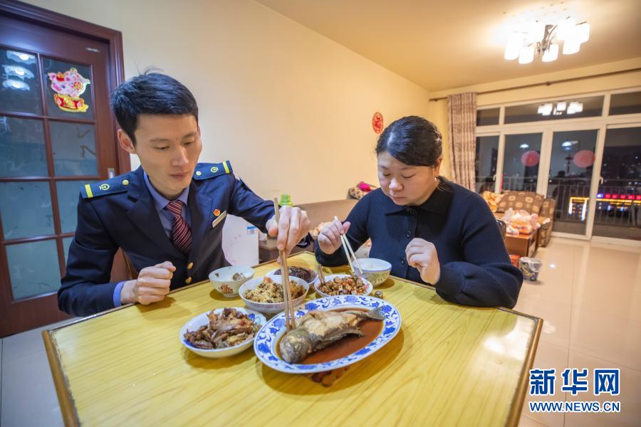 2月10日,付寶印與妻子孫夢潔在重慶市渝中區家中吃晚飯。新華社記者 黃偉 攝