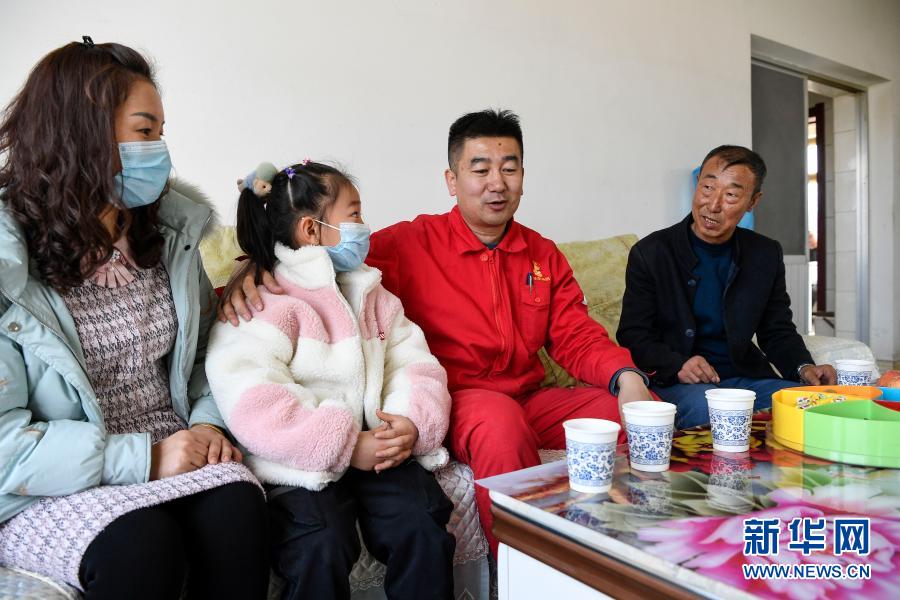2月11日除夕當天,王濤(右二)和妻子女兒走訪看望脫貧戶劉玉強(右一)。劉玉強家過去住的是土房,2017年脫貧并蓋了新房,2019年還開起了農家樂。