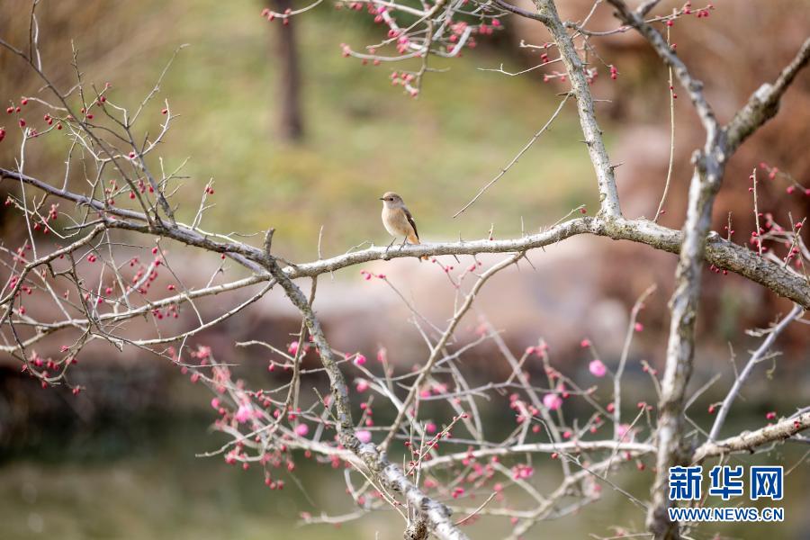 2月14日,在江蘇揚州瘦西湖湖畔,一只小鳥在梅枝上停歇。新華社發(fā)(齊立廣 攝)