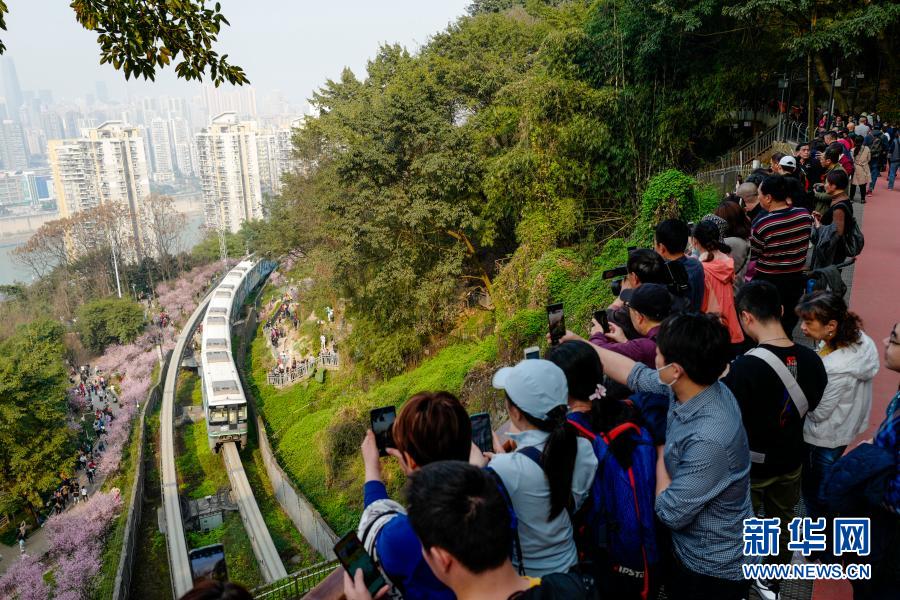 2月23日,在重慶軌道交通2號(hào)線(xiàn)佛圖關(guān)段,游客在山城步道上拍攝穿越花海的單軌列車(chē)。