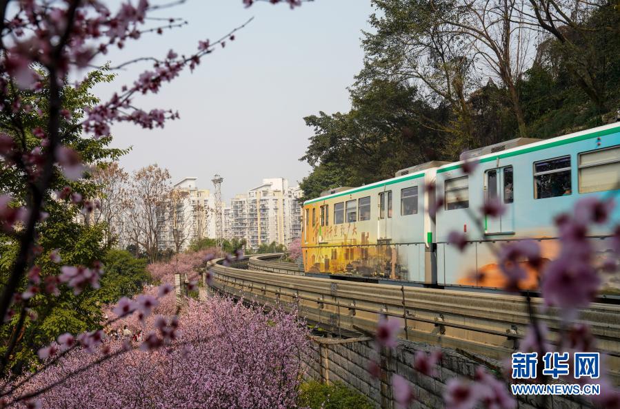 2月23日,在重慶軌道交通2號線佛圖關段,一列單軌列車穿越花海奔馳而過。