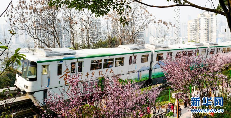 初春時節,重慶氣溫逐漸回暖,暖陽里的山城春意盎然。在重慶軌道交通2號線佛圖關段,山城步道上的梅花簇簇綻放,單軌列車穿越花海,組成一幅賞心悅目的獨特城市景觀。