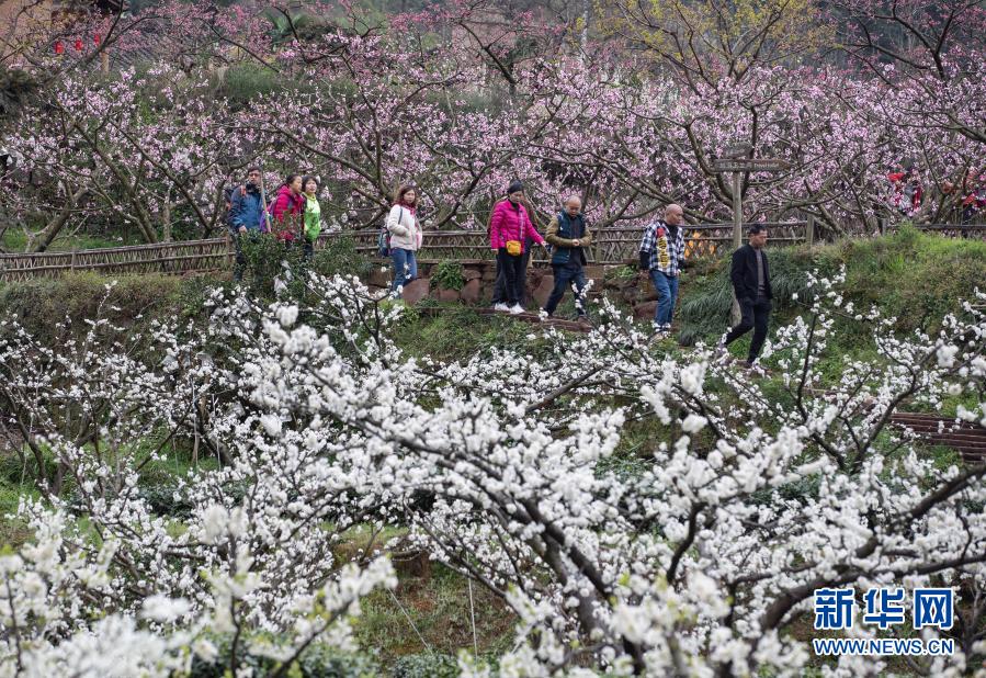 3月1日,游客徜徉在幸福古村的花叢中。新華社記者 江宏景 攝