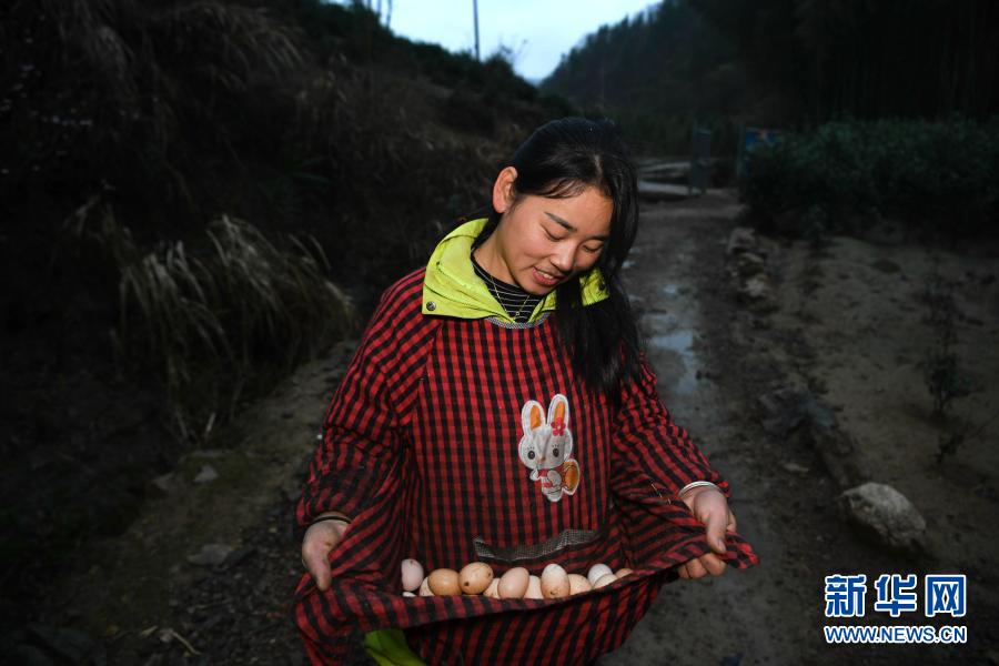張志菊從自家農場撿回雞蛋(2月25日攝)。