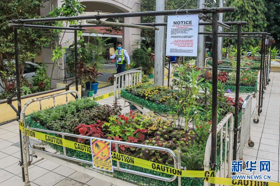 3月18日,在位于馬尼拉的菲律賓大學附屬菲律賓總醫院,一名安保人員看向“低語的花床”藝術裝置。
