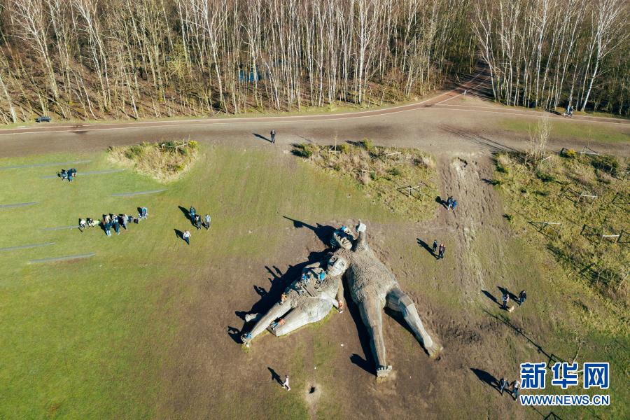 這是3月20日在比利時博姆市的德舒爾森林公園拍攝的“巨人”雕塑(無人機照片)。新華社記者 張鋮 攝