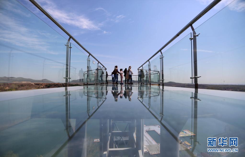 4月5日,游客在山東省臨沂市沂南縣紅石寨景區(qū)內(nèi)體驗高空玻璃棧道。
