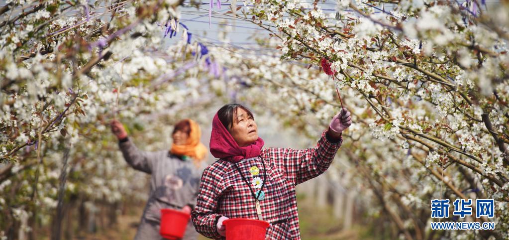 4月6日,山東濱州鄒平市長山鎮(zhèn)八方農(nóng)場的果農(nóng)在給梨花授粉。