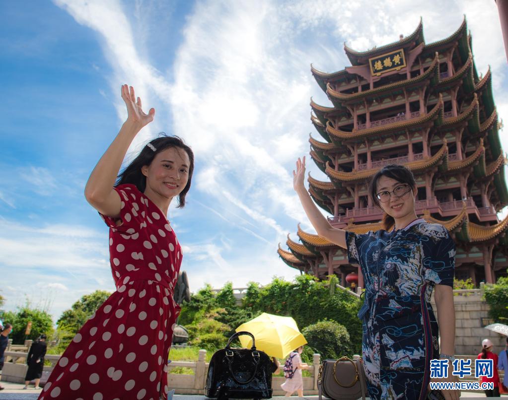 2020年8月7日,受邀來湖北旅游的海南援鄂醫(yī)療隊(duì)員陳小妹(左)與同事計(jì)超在黃鶴樓景區(qū)觀光。湖北省組織“與愛同行 惠游湖北”活動(dòng),陸續(xù)邀請(qǐng)?jiān)踽t(yī)護(hù)人員代表以及湖北醫(yī)護(hù)人員、社區(qū)工作者、志愿者等走進(jìn)景區(qū),飽覽荊楚風(fēng)貌。新華社記者 肖藝九 攝