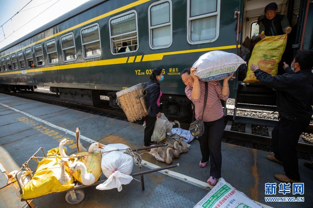 5633次列車停靠車站后,彝族小商販忙著把貨卸下來(4月11日攝)。新華社記者 沈伯韓 攝
