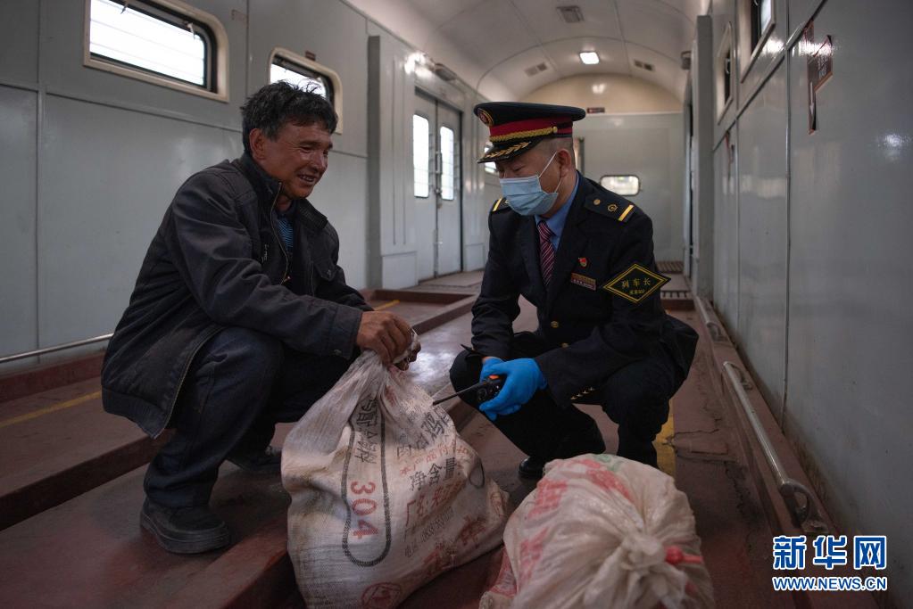 在5633次列車的“行李車廂”內(nèi),中國鐵路成都局集團(tuán)公司成都客運(yùn)段5633/5634次列車長(zhǎng)劉偉(右)了解村民攜帶牲畜情況(4月11日攝)。新華社記者 胥冰潔 攝