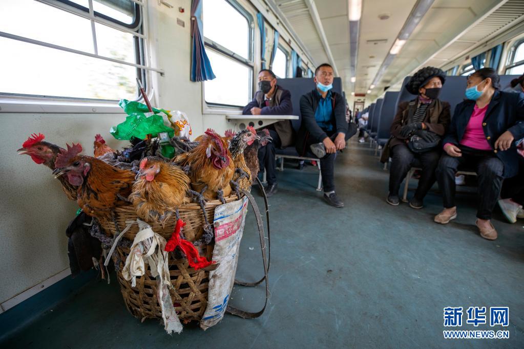 5633次列車上擺放著一筐要被乘客帶到西昌集市上出售的雞(4月11日攝)。新華社記者 沈伯韓 攝