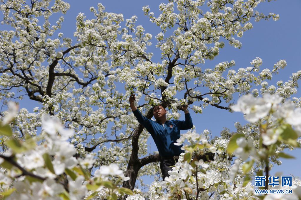 4月19日,農民在河北省承德縣新杖子鎮葦子峪村梨園為梨樹疏花。