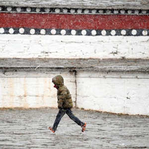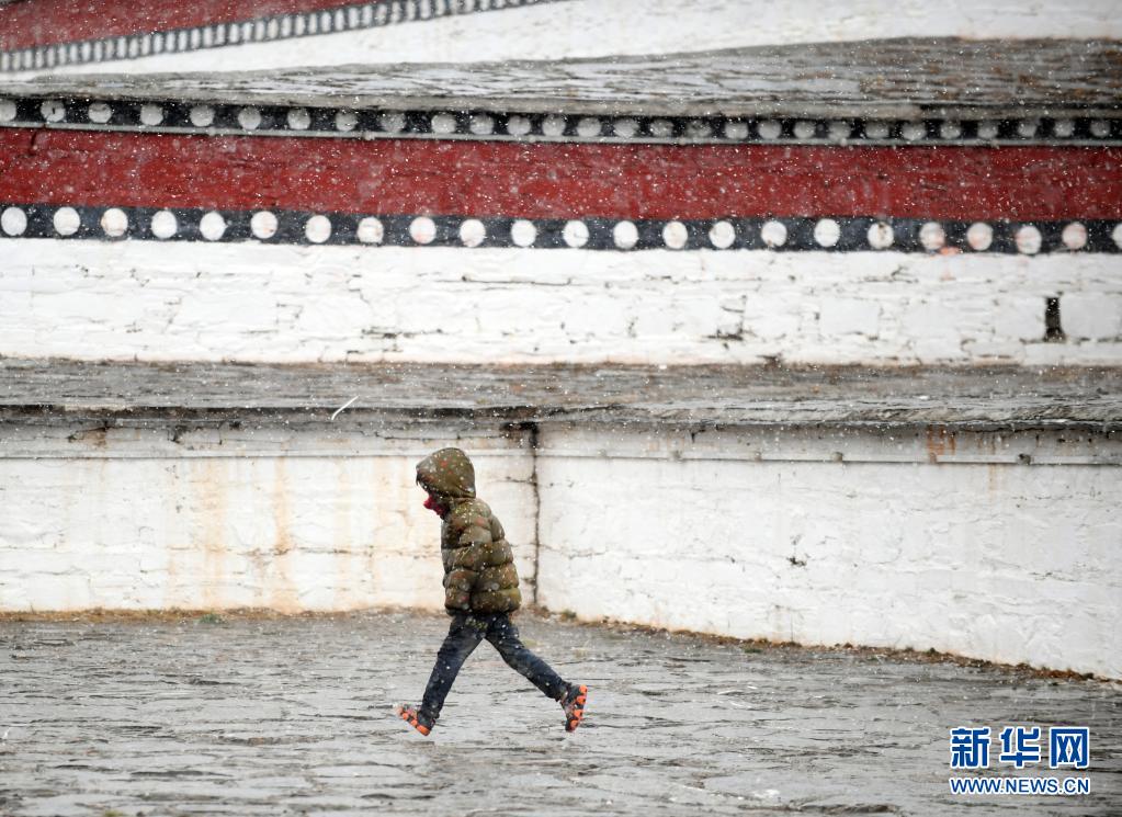 這是4月19日在青海省果洛藏族自治州甘德縣拍攝的雪中行走的孩子。
