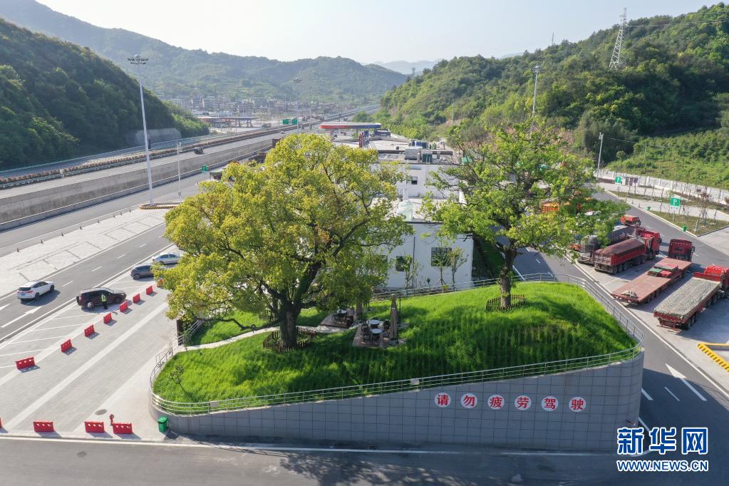 杭州第二繞城高速西復線次塢服務區有3棵樹齡在100年以上的古樹。服務區在建設過程中,將古樹保護起來,現已成為一道特色景觀。新華社發(郭斌 攝)