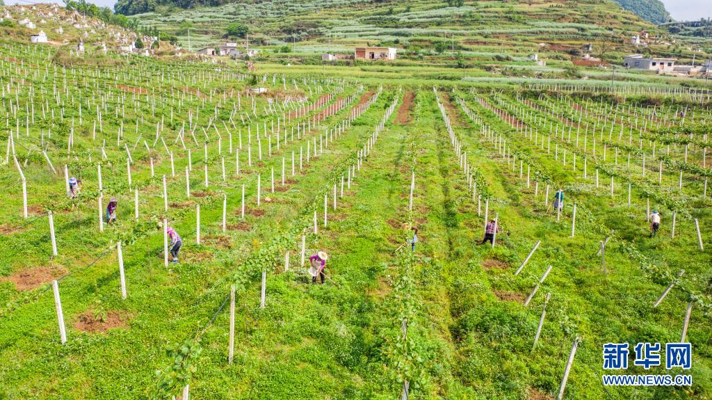 4月20日,貴州省六盤水市六枝特區木崗鎮農民在田地里勞作(無人機照片)。