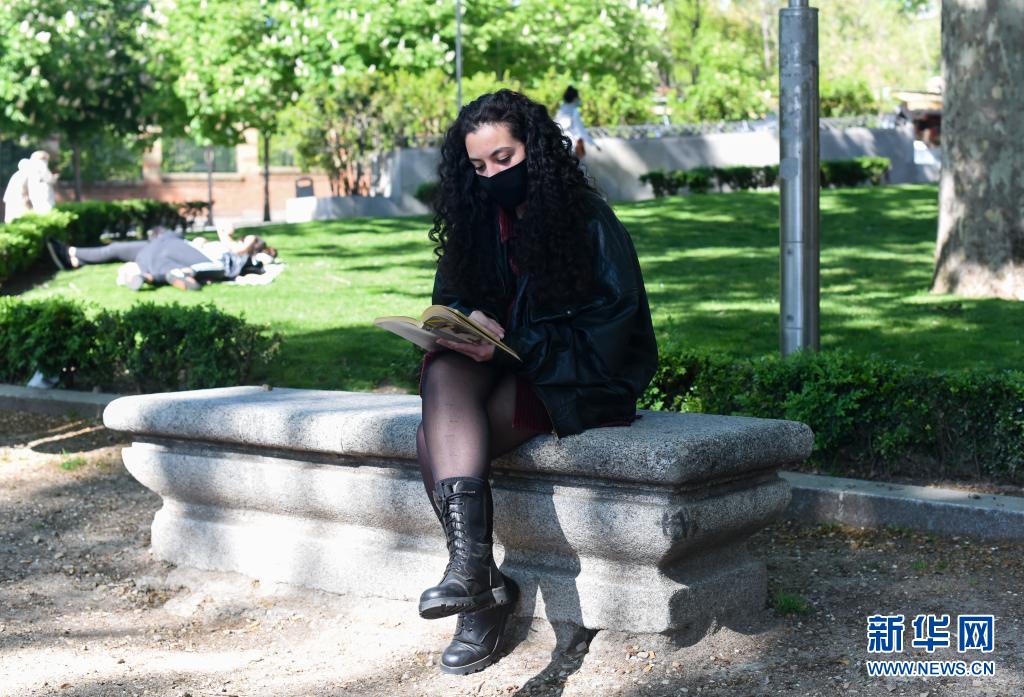 4月17日,一名女子在西班牙馬德里一個公園內讀書。