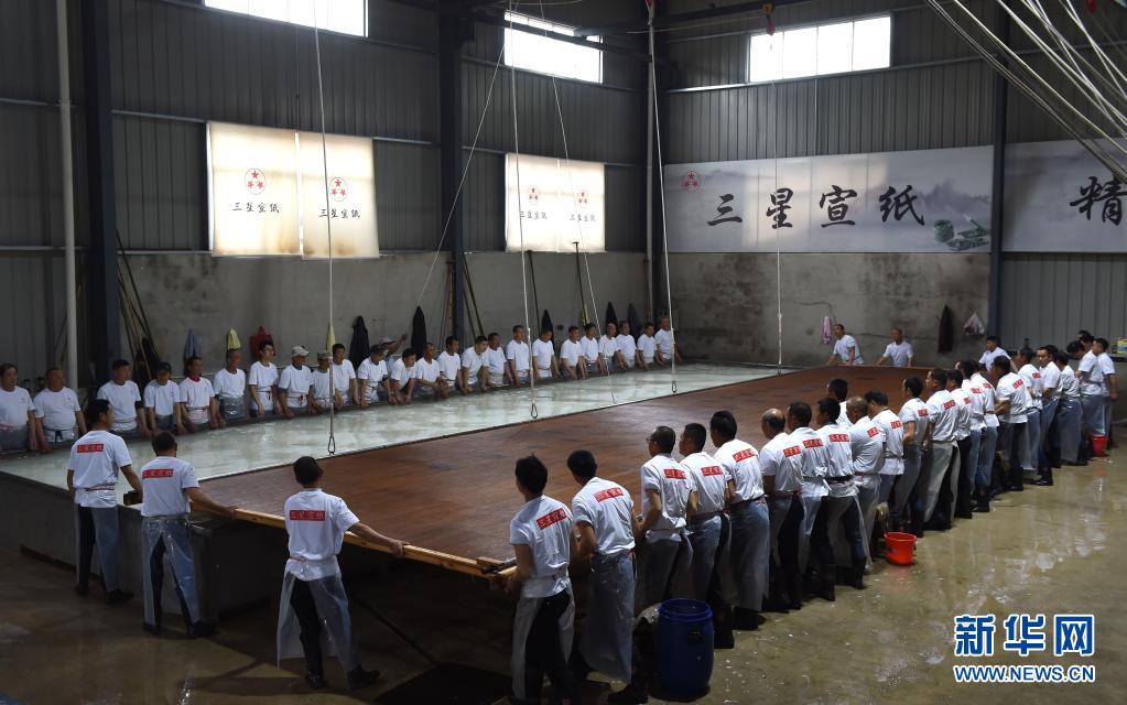 近日,在宣紙產(chǎn)地安徽省宣城市涇縣,“四丈宣紙”的抄制在一家紙業(yè)有限公司啟動。50余名撈紙師傅操作巨型紙簾,齊心協(xié)力,在紙槽旁進(jìn)行撈紙作業(yè)。來回起落兩次,動作整齊劃一。隨后工人們將紙簾吊起放至一邊揭下,一張巨大的宣紙便撈制成功。經(jīng)過曬、剪等工序后, 制成長13.2米、寬3.6米的巨型宣紙就是“四丈宣紙”。