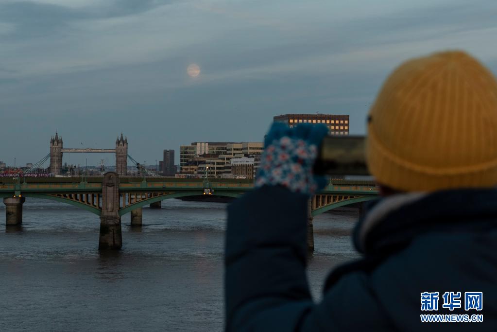 4月26日,一名女子在英國倫敦拍攝塔橋上空的“超級月亮”。
