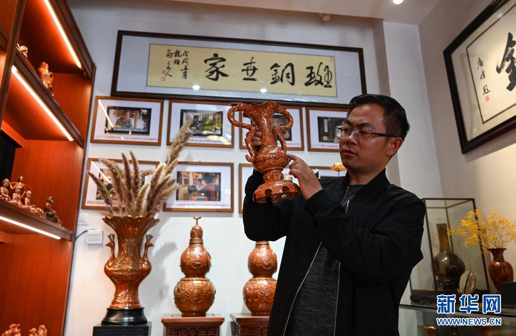 地處滇東北、烏蒙山腹地的云南會(huì)澤縣流傳著具有300多年歷史的斑銅制作工藝。斑銅工藝復(fù)雜,要采用高品位的銅為原料,經(jīng)過20余道工序制作而成。產(chǎn)品“妙在有斑,貴在渾厚”,風(fēng)格獨(dú)樹一幟。33歲的張偉是會(huì)澤“張氏斑銅”的第十三代傳人。自幼深受地域文化和家庭熏陶的他,大學(xué)畢業(yè)后,返鄉(xiāng)從事斑銅制作工作。在會(huì)澤古城的“銅匠街”,張偉創(chuàng)辦了斑銅傳習(xí)館,不斷研發(fā)斑銅新產(chǎn)品、傳承著這項(xiàng)非遺技藝?!鞍咩~是一種情感、一種文化,希望在我們這代人的努力下能夠更好地將它傳承下去,讓更多人了解斑銅的獨(dú)特魅力?!睆垈フf。