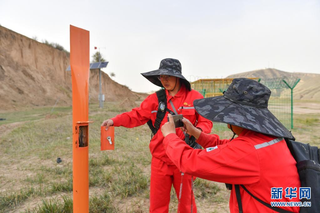 4月28日,巡線隊員侯勵峰、曹碩(左)在巡線途中拍照記錄一處設置故障。新華社記者 張博文 攝