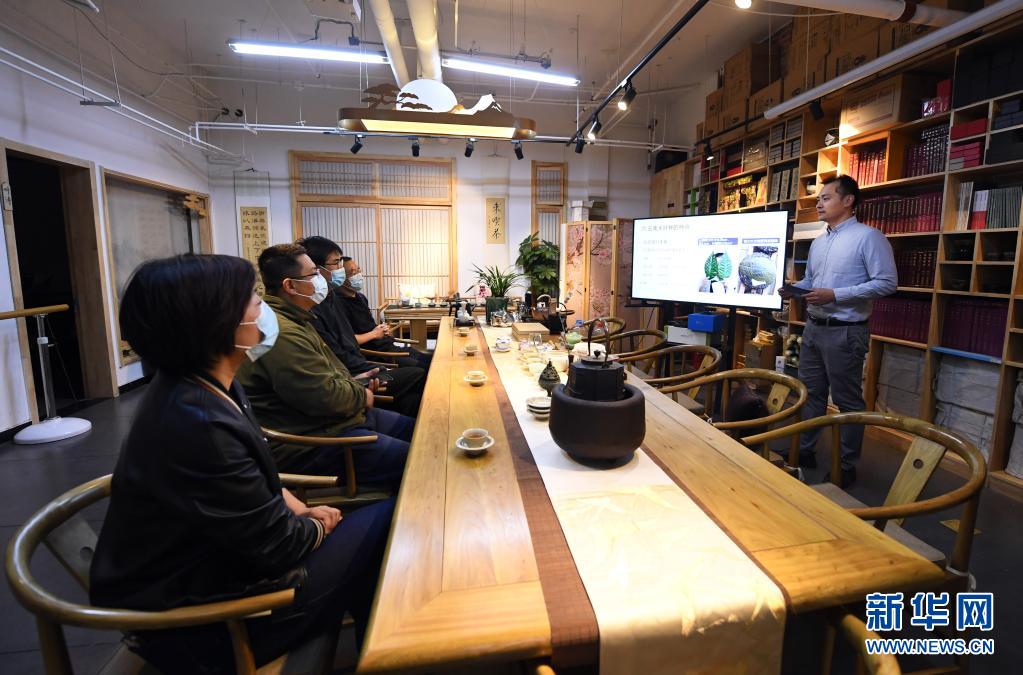 李卓澄(右)在“小茶館”中為客人介紹茶知識(shí)(4月29日攝)。新華社記者 任超 攝